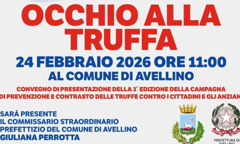 Prende il via la terza edizione di “Occhio alla Truffa”, la campagna dedicata alla prevenzione e al contrasto delle truffe ai danni dei cittadini, con un’attenzione particolare rivolta alle persone anziane. L’iniziativa sarà presentata ufficialmente il 24 febbraio 2026, alle ore 11:00, nel corso di un convegno ospitato dal Comune di Avellino.